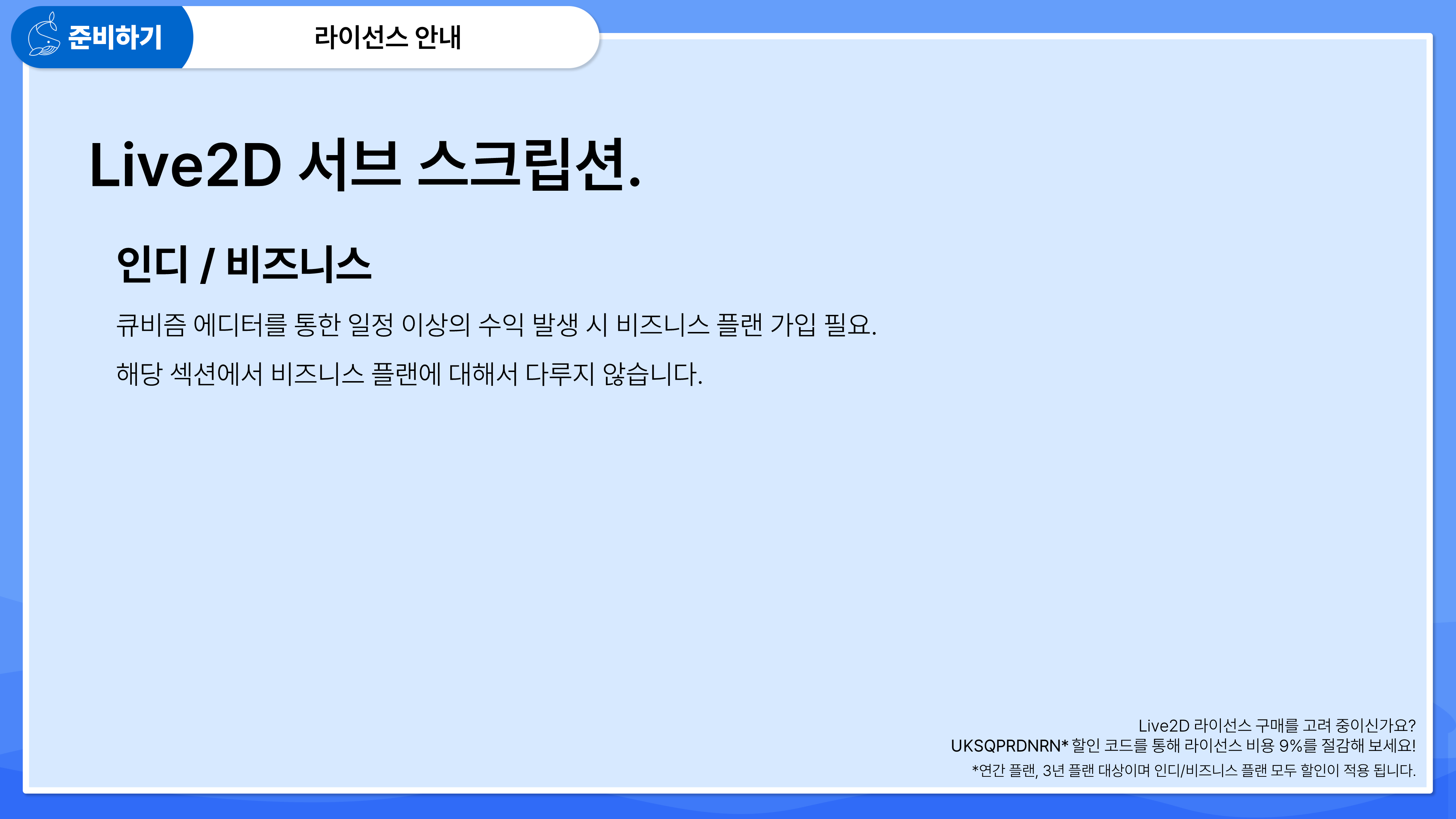 이번 편의 마지막으로 Live2D의 라이선스에 대해서 안내해드리겠습니다.