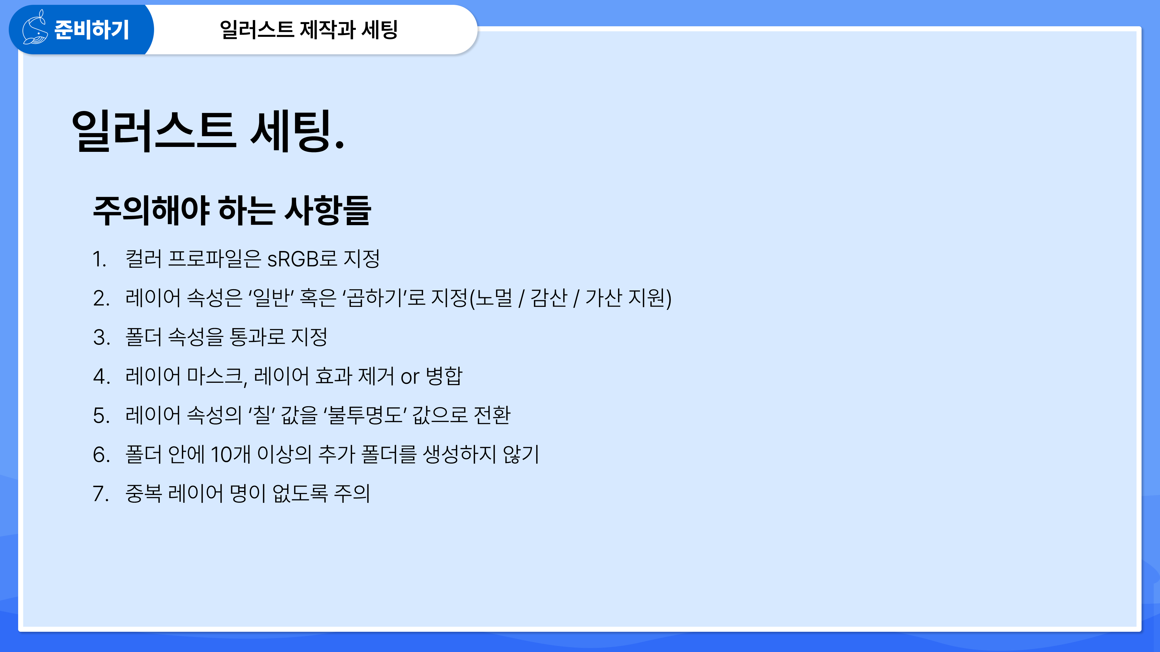 애니메이션용 일러스트는 일반 일러스트와 어떤 차이점이 있는지 일러스트 세팅 시 어떤 주의사항이 있는지 알아보도록 합시다.