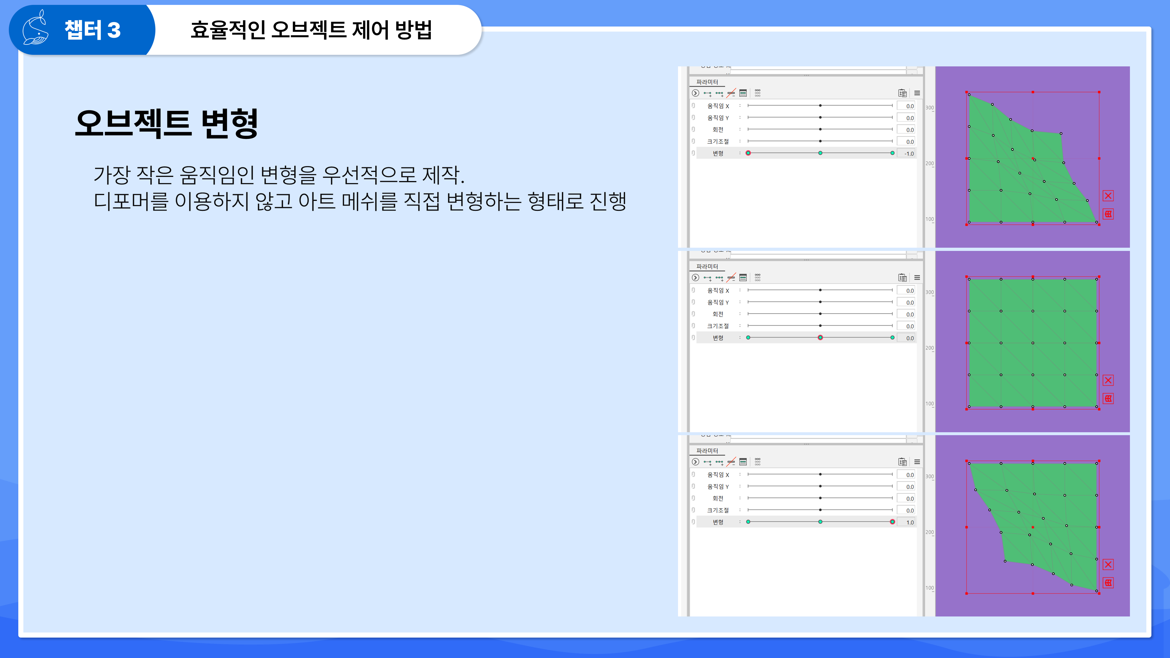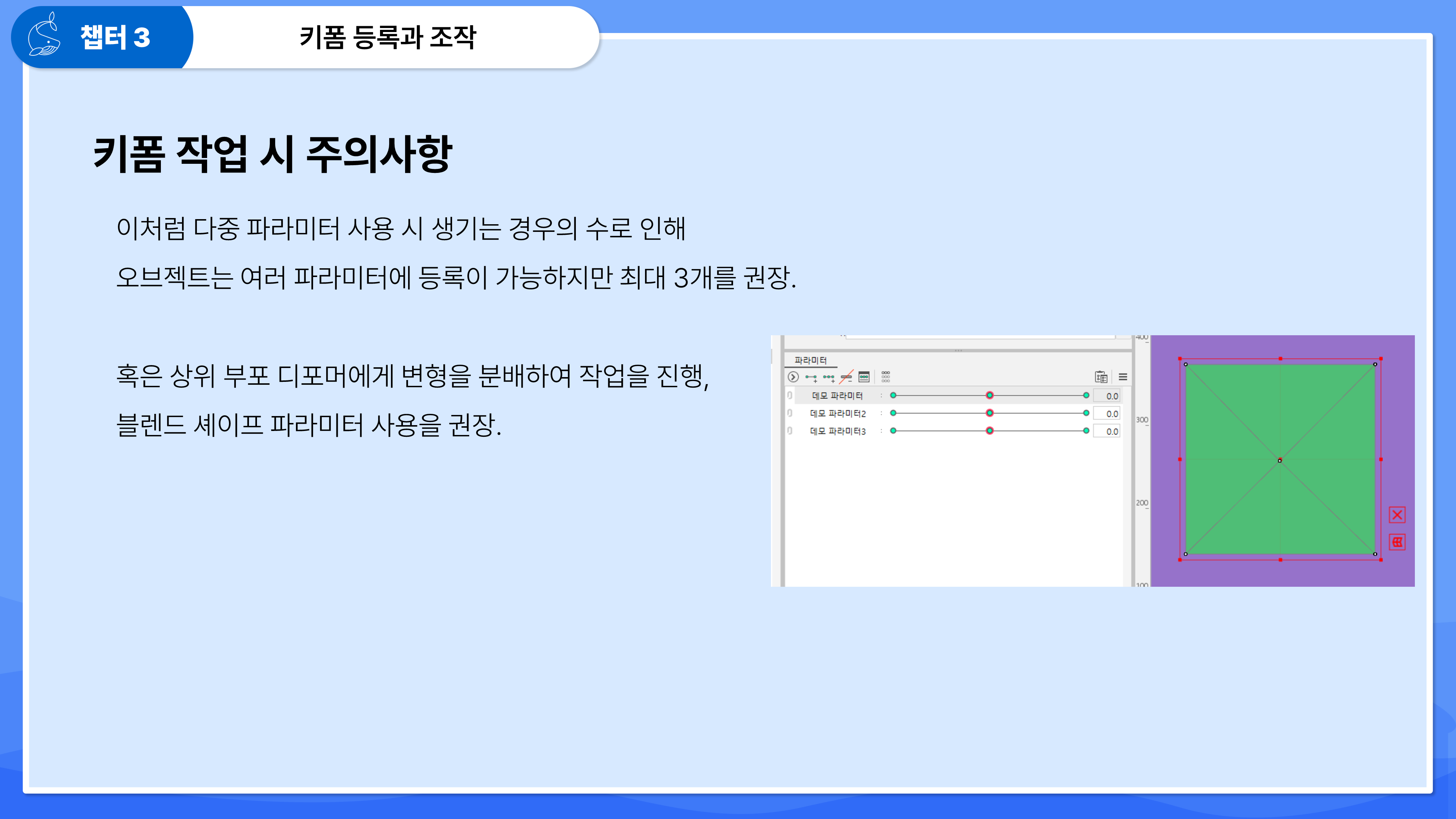 파라미터 한개마다 특정한 오브젝트의 변형을 등록하고 파라미터 제어를 통해 다양한 움직임과 표현을 만들어 낸다고 보시면 됩니다.