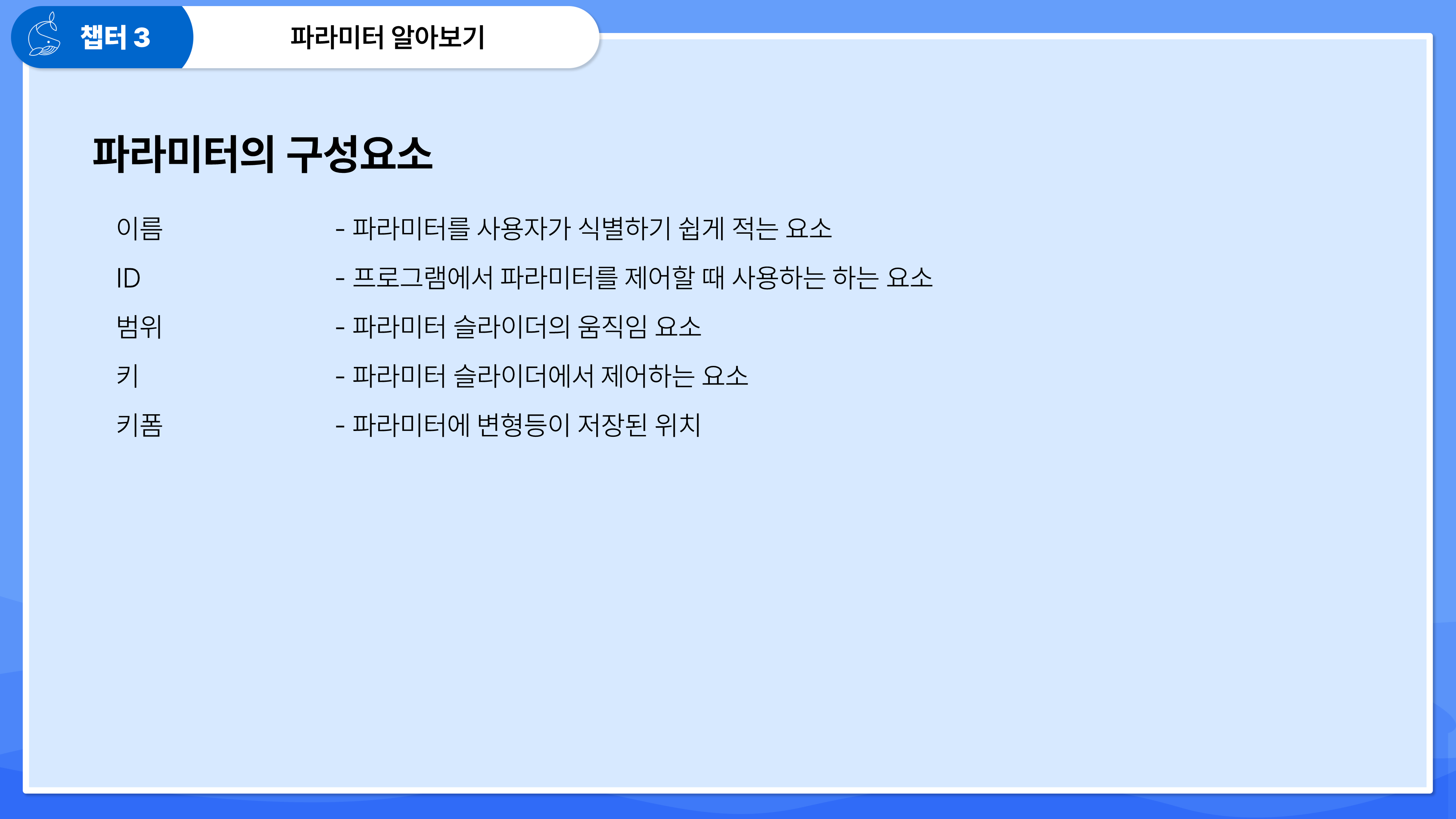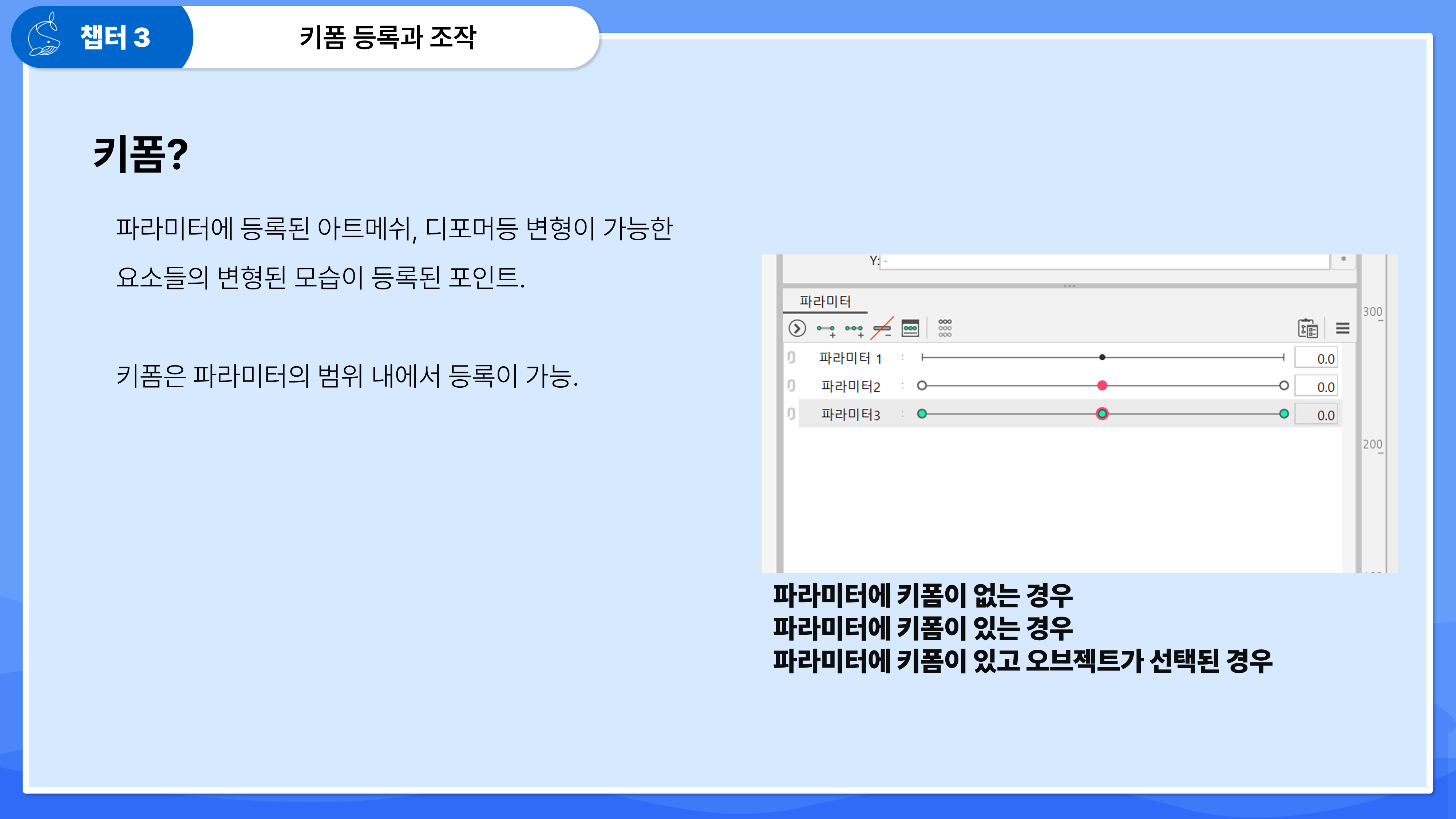 - 키 - 파라미터 슬라이더에서 제어를 요소입니다. 키를 움직여 파라미터의 수치를 조절합니다.