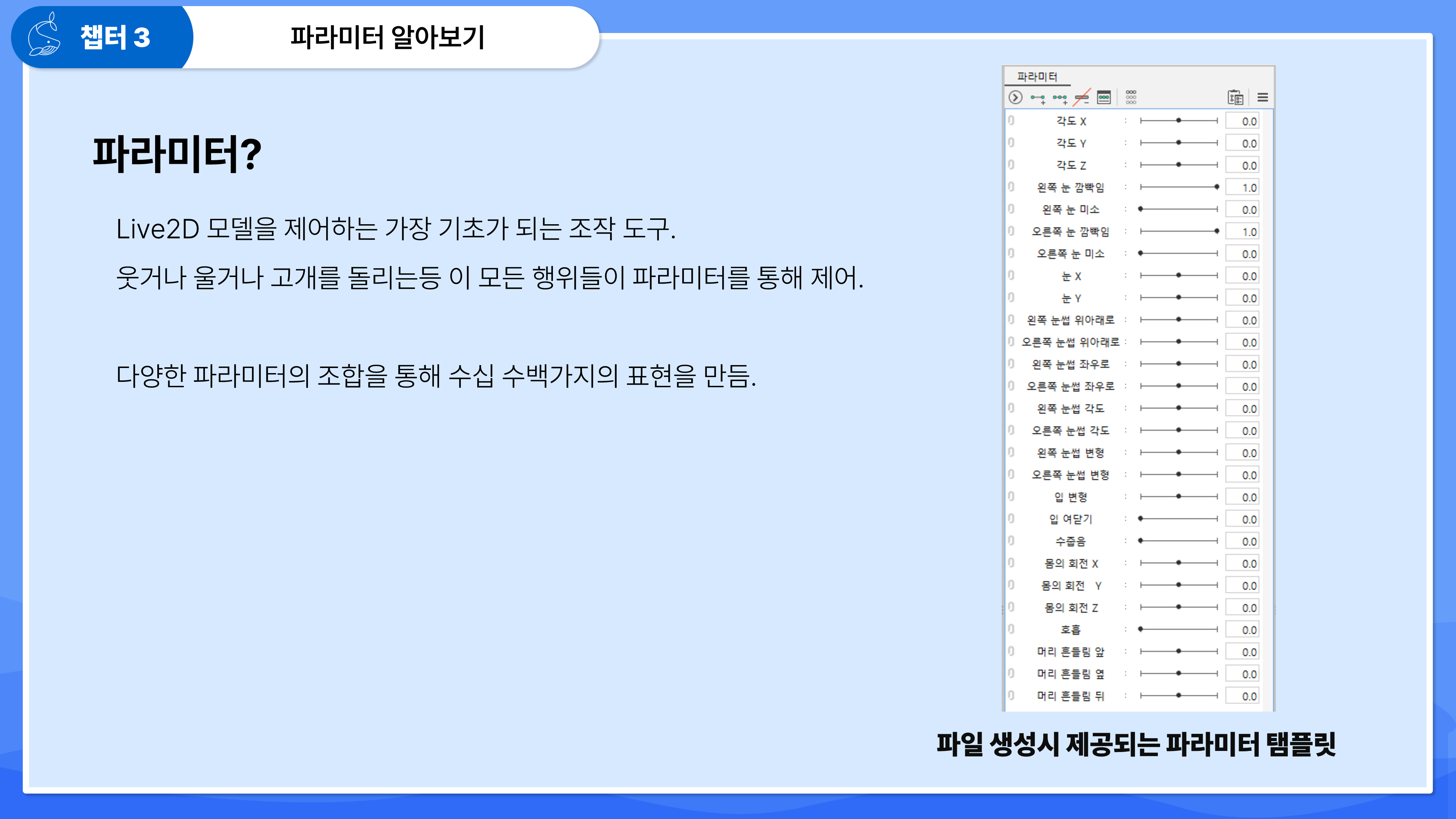 파라미터는 Live2D 모델을 제어하는 가장 기초에 되는 도구입니다.