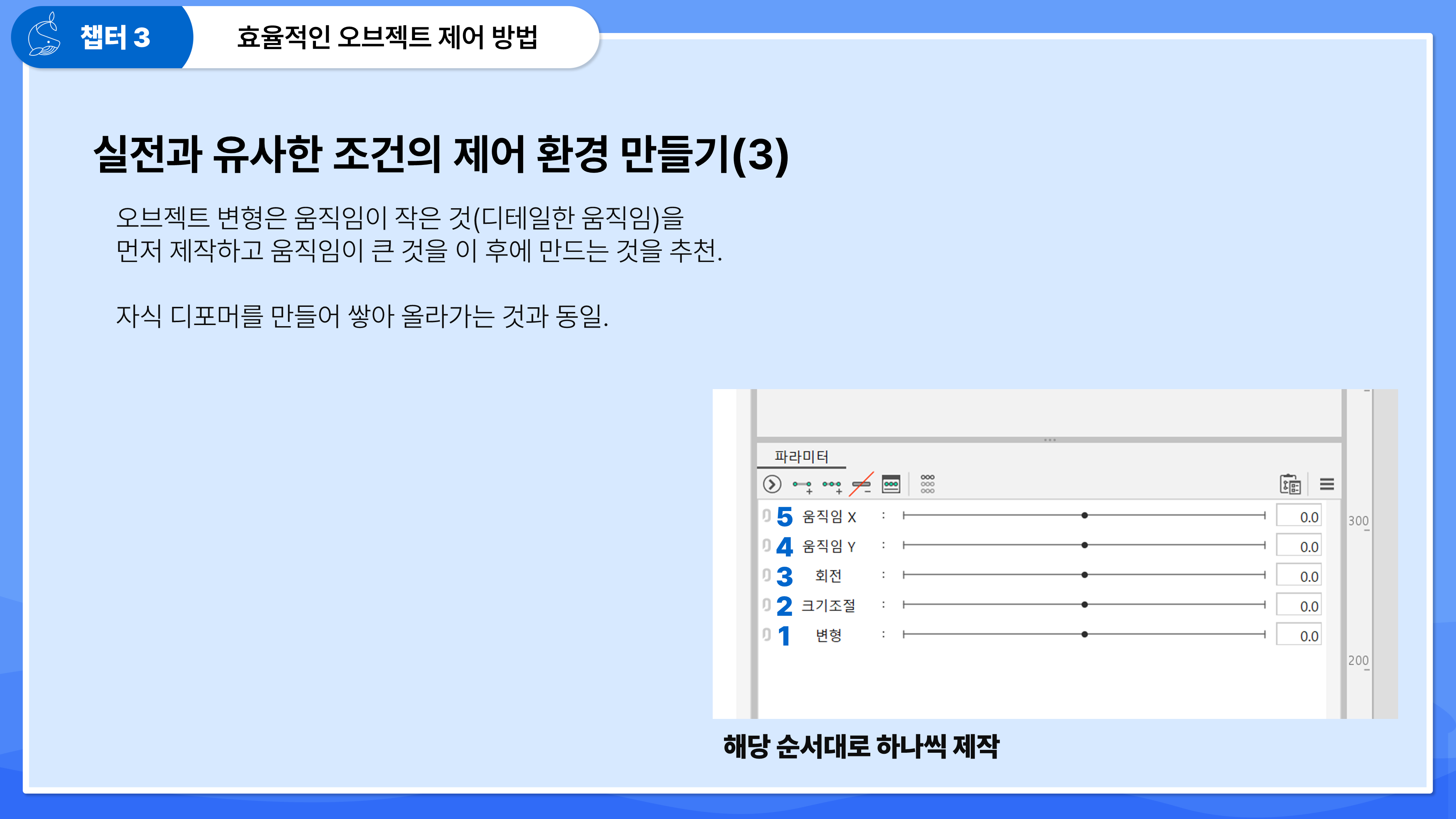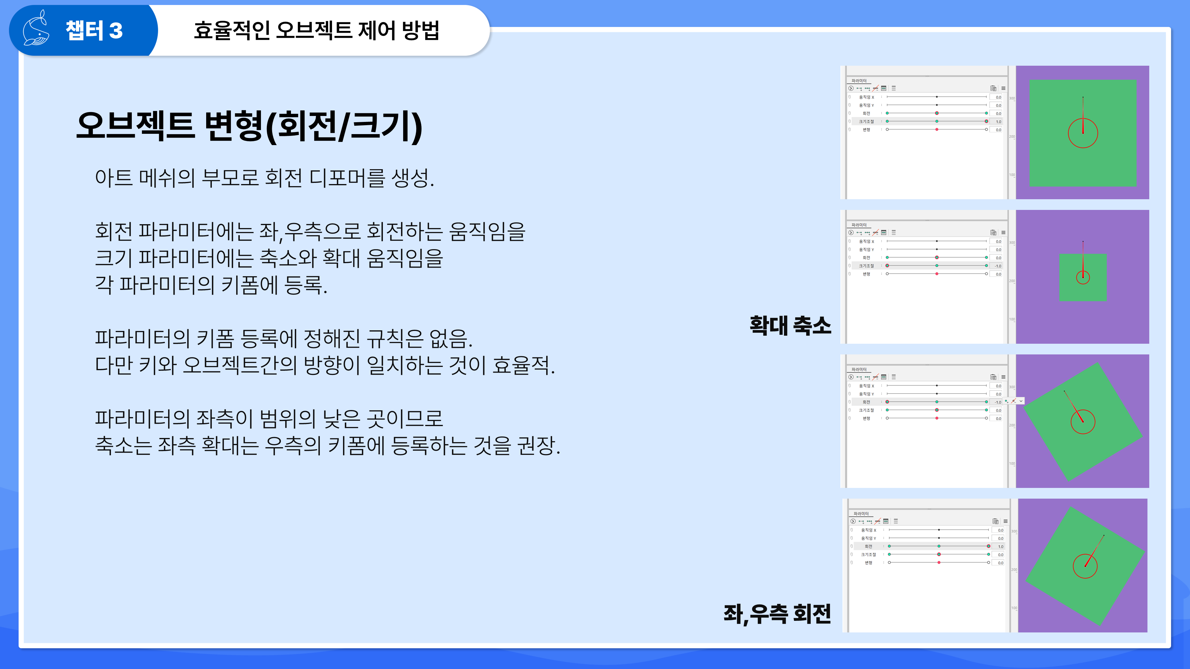 그렇기에 가장 변형의 정도가 작은 변형을 맨 처음 만들고 이후 회전과 크기 조절을 그리고 가장 변형의 정도가 큰 움직임을 마지막으로 만드는 형태로 진행해 보겠습니다.