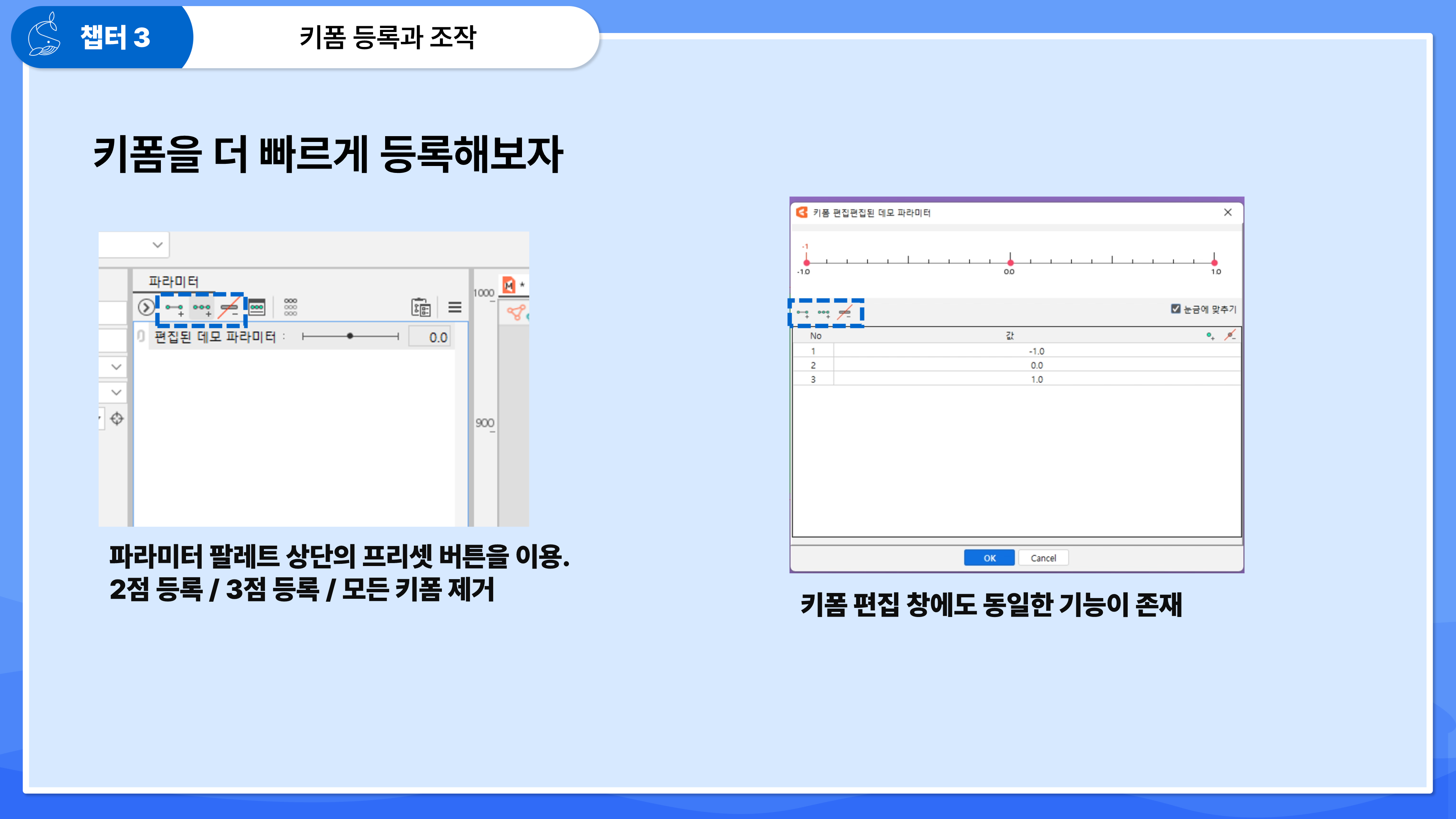 파라미터 팔레트 상단에 있는 프리셋 버튼을 이용해 빠르게 2점 / 3점을 등록하거나 등록된 모든 키폼을 제거 할 수 있습니다.