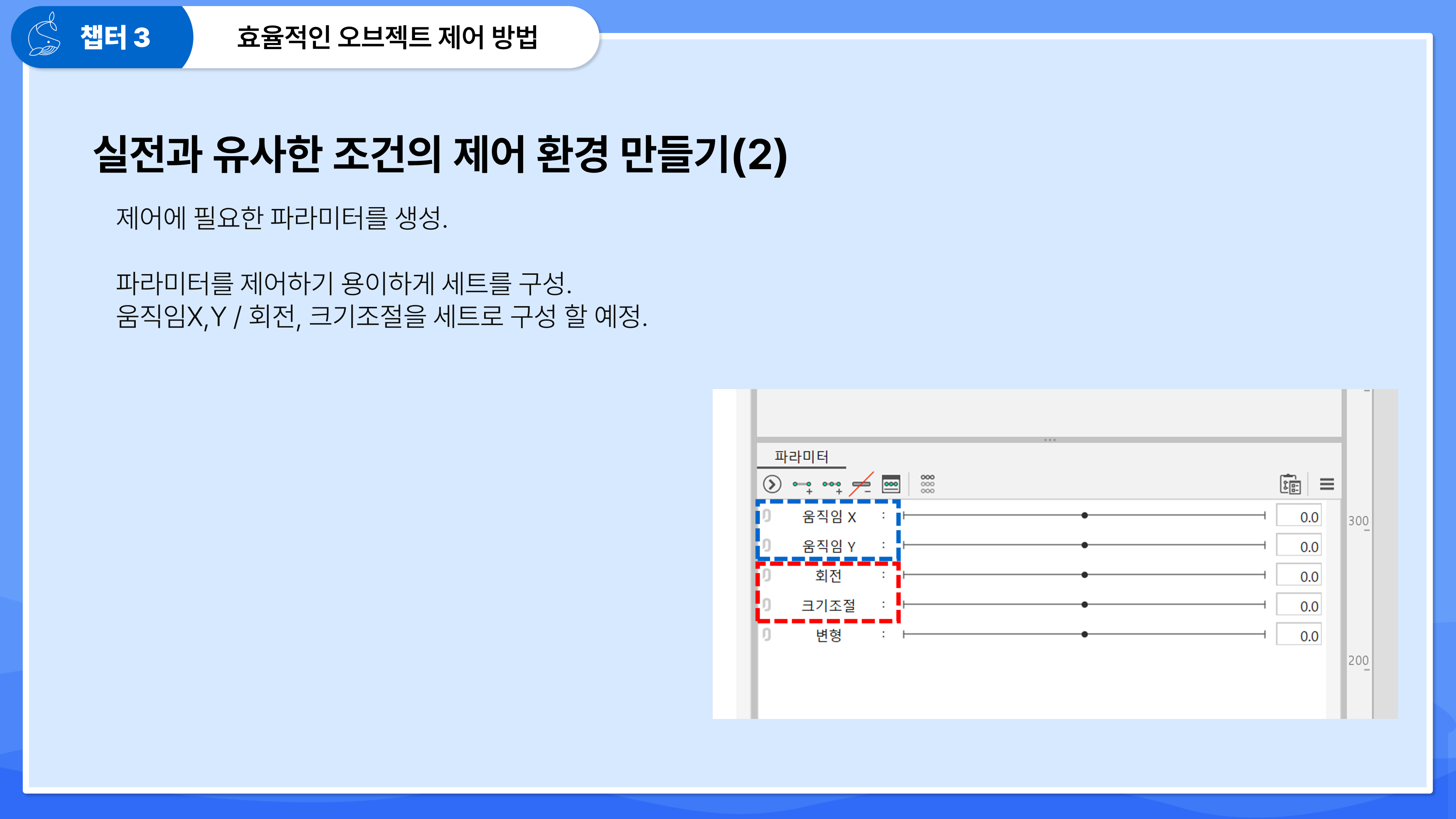 원하는 움직임 구현을 위해 어떤 변형이 필요한지 생각하며 그에 맞게 파라미터를 생성해 주면 됩니다.