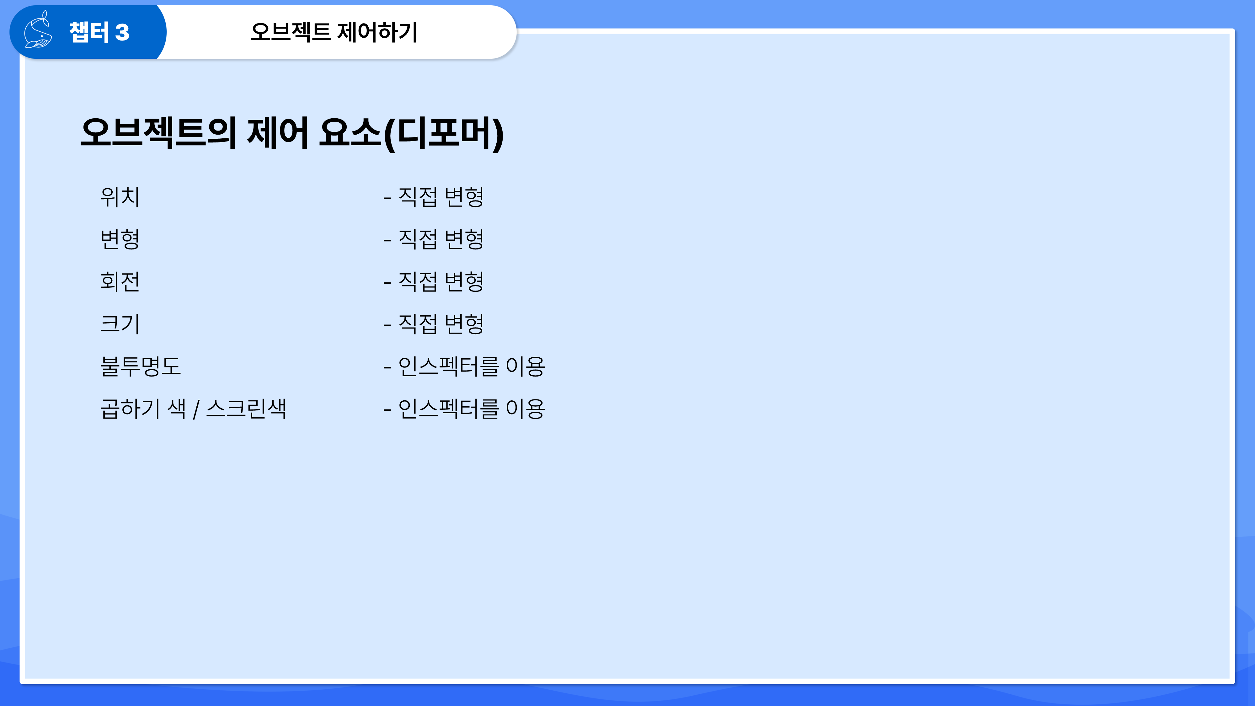 해당 오브젝트를 선택했을때 나오는 인스펙터 팔레트에서 제어가 가능한 요소가 있으므로 어떤 요소가 인스펙터에서 제어 가능한지 참고하시면 될 것 같습니다.