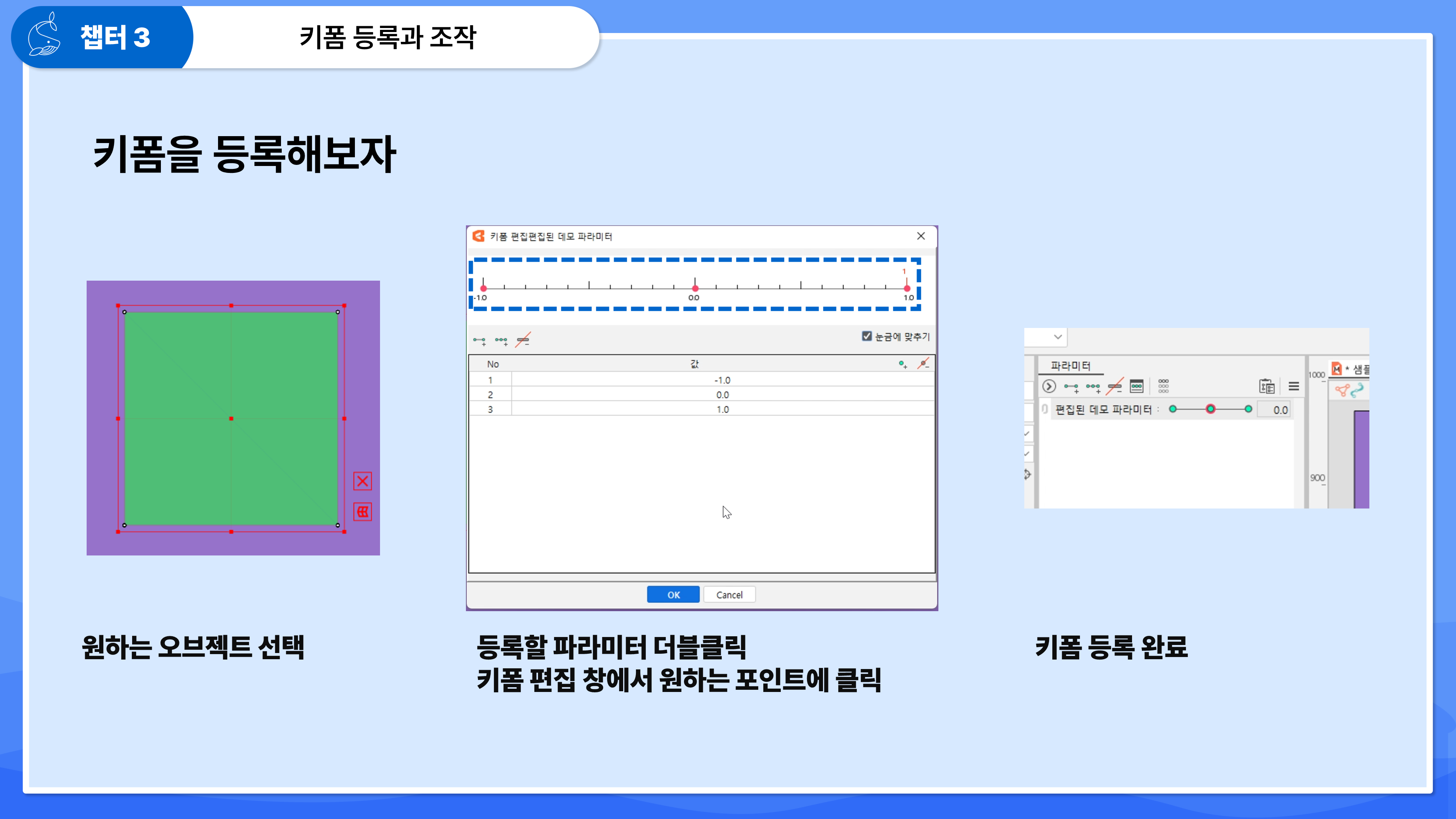이번에는 파라미터에 키폼을 등록하여 오브젝트를 본격적으로 조작을 해보도록 합시다.