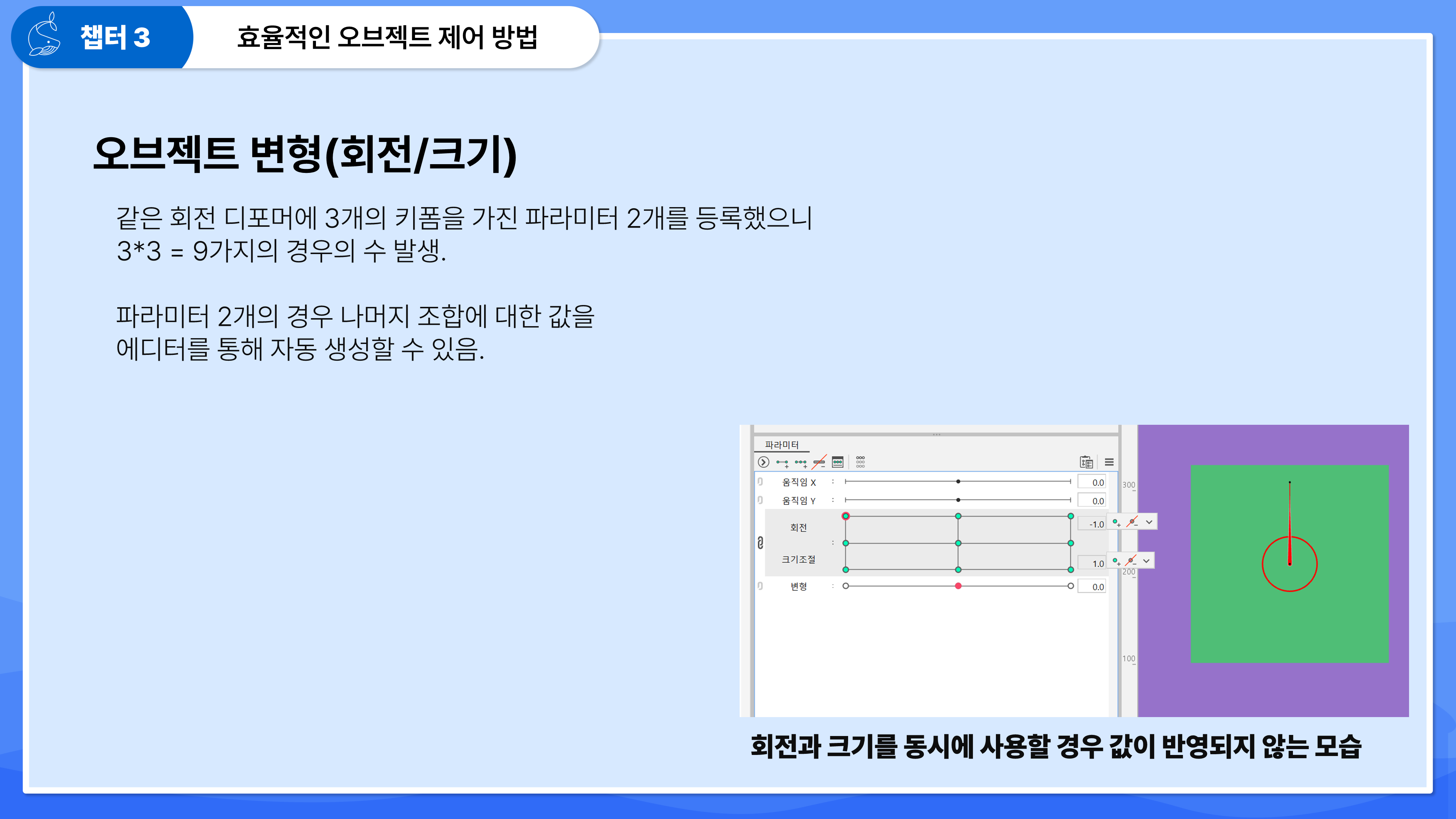 이후에 회전과 크기 제어 파라미터를 동시에 사용하였을 때 정상적으로 오브젝트가 변형이 되는지 체크해봅니다.